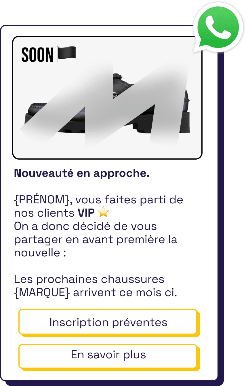 Voici un exemple. Imaginons une marque de chaussures qui prépare la sortie de sa nouvelle paire. Cette marque peut annoncer en avant première la sortie sur WhatsApp au segment VIP avec un lien pour des préventes. Puis envoyer un mail au segment plus large lors de la sortie officielle de la paire.